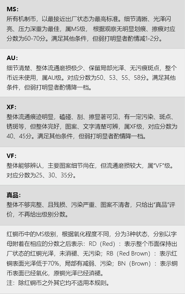 注:1、元宝根据其宝面的状态先行定级为UNC、AU、XF、VF、F状态。